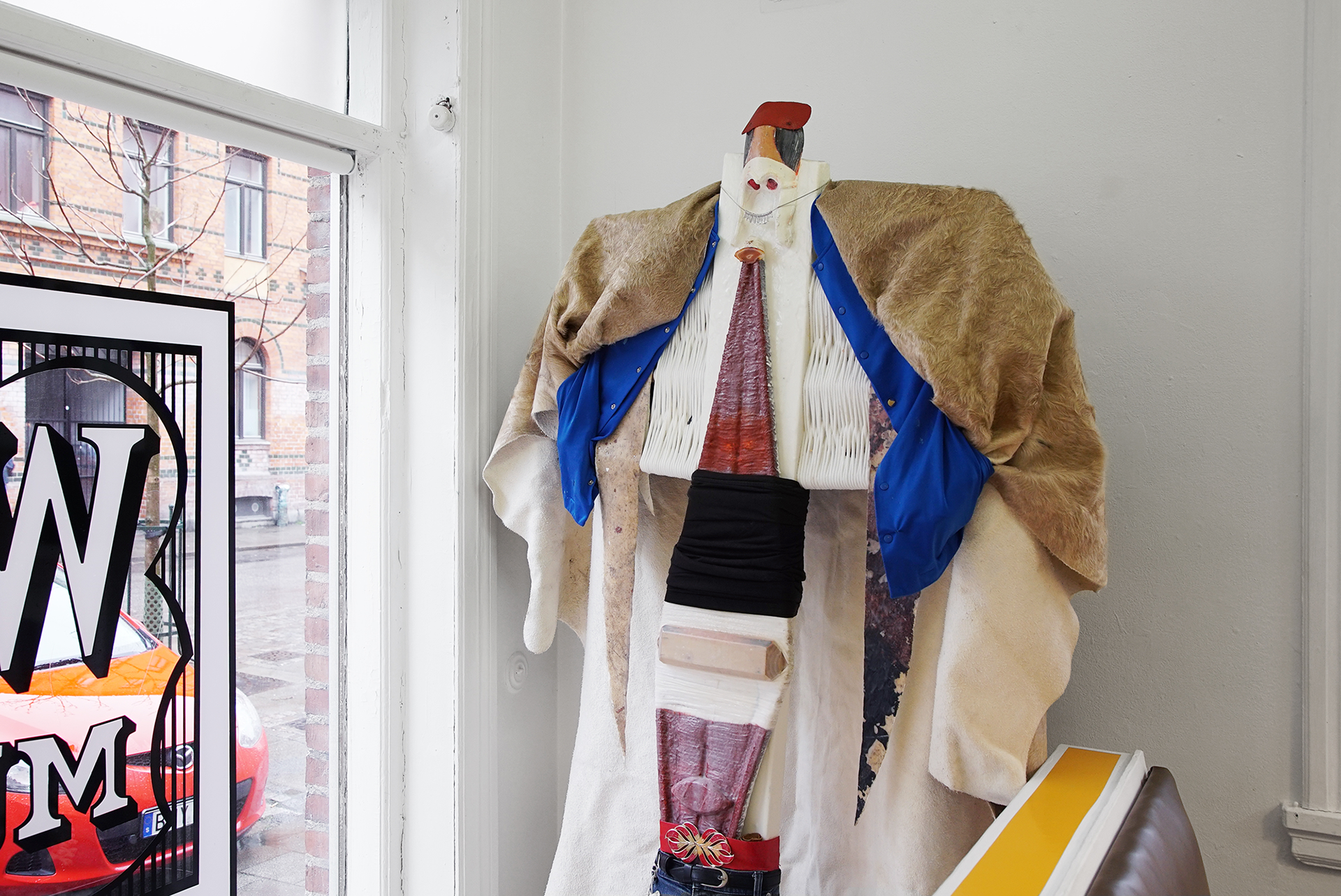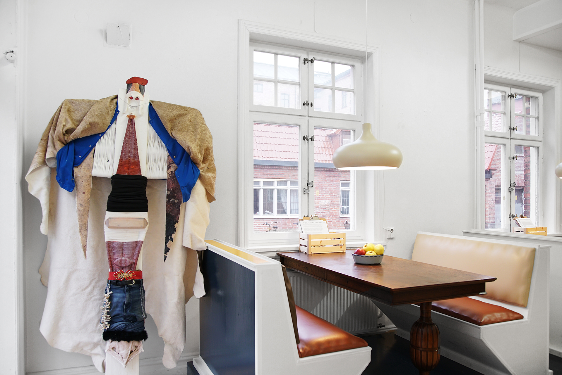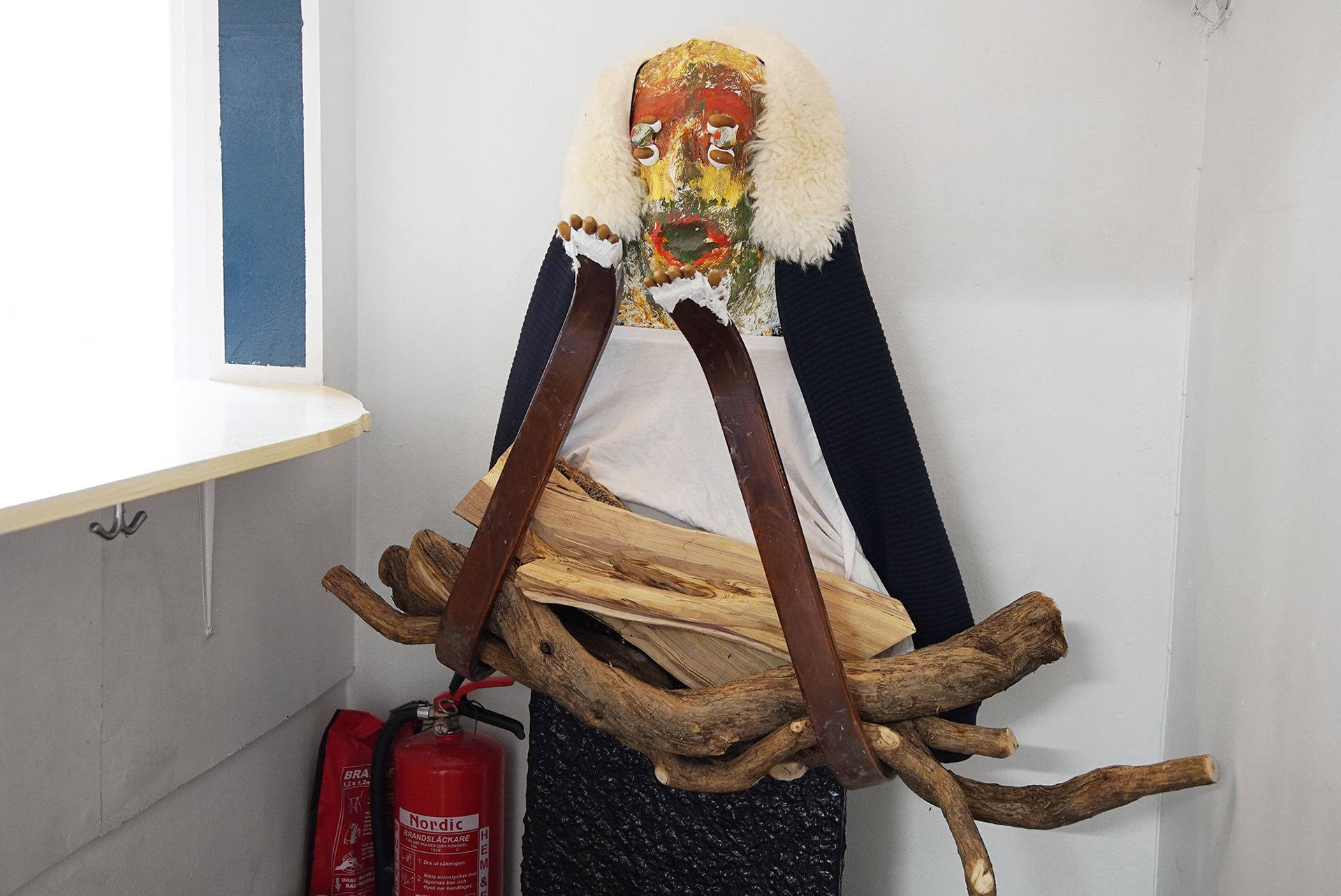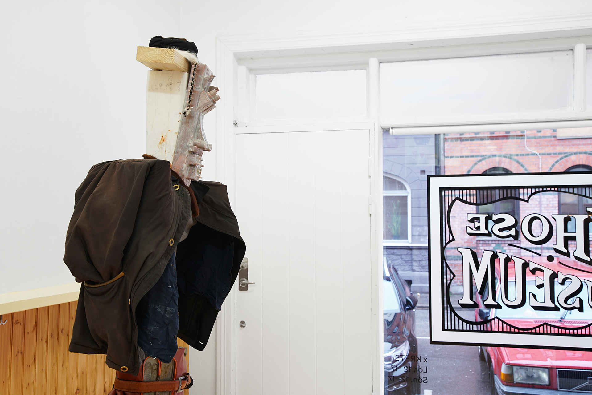 It is a diner here, with booths and all. The collection of Whose Museum is shown together with some of the things that have wanted to come with me to my studio over the years. One fills out a form to donate things to Whose Museum. No one has donated the things I have brought along, they can leave anytime, if they would want to. We are not yet done with one another, we look at each other nearly every day. In a compartment in the wall sit some plants from Malmö. They smell good, and are fixed with sticks that have perhaps been carved by the sculptures. I brought along a few sculptures as guests, but I can’t find menus for them. Instead we look and hang out, hang out and look, as one does. Behind the bar is a pizza oven. One of my guests became employed there, carries wood to the oven, shovels pizzas. Another guest has already got their pizza and is about to bite into it. The other two are doing their best to find someone to talk to about what they have seen lately. What should the sculptures be looking at? The beholders wonder when they see past the materials and into the souls of the visitors at the diner, the living and the dead. Be careful about what you give away.